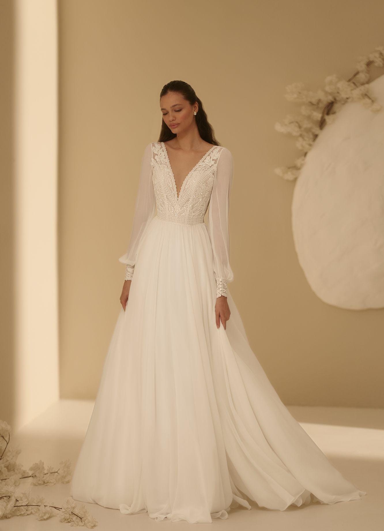 Accents : une robe romantique en coupe A à manches longues. Le corset est en dentelle bohème et brodé de paillettes ; il présente un décolleté en V profond avec un empiècement en maille translucide. Les manches volumineuses avec des poignets en dentelle rendent le look très léger et romantique.